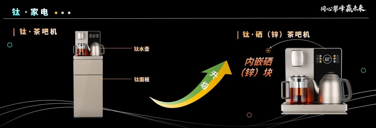 钛建材筑就了零碳住宅的梦想,钛家居守护着家庭健康的防线,钛版画融合了艺术与科技的魅力,钛家电、钛餐厨、钛杯壶渗透到了生活的每一个角落。