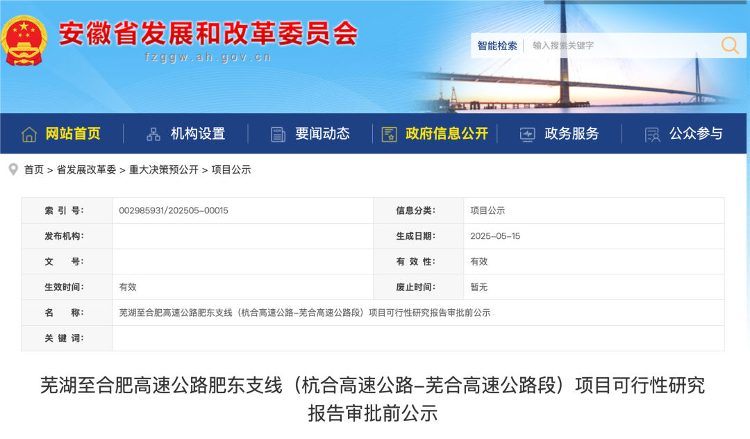 5月15日,安徽省发改委发布《上海至西安高速公路路口支线项目可行性研究报告审批前公示》和《芜湖至合肥高速公路肥东支线(杭合高速公路-芜合高速公路段)项目可行性研究报告审批前公示》。