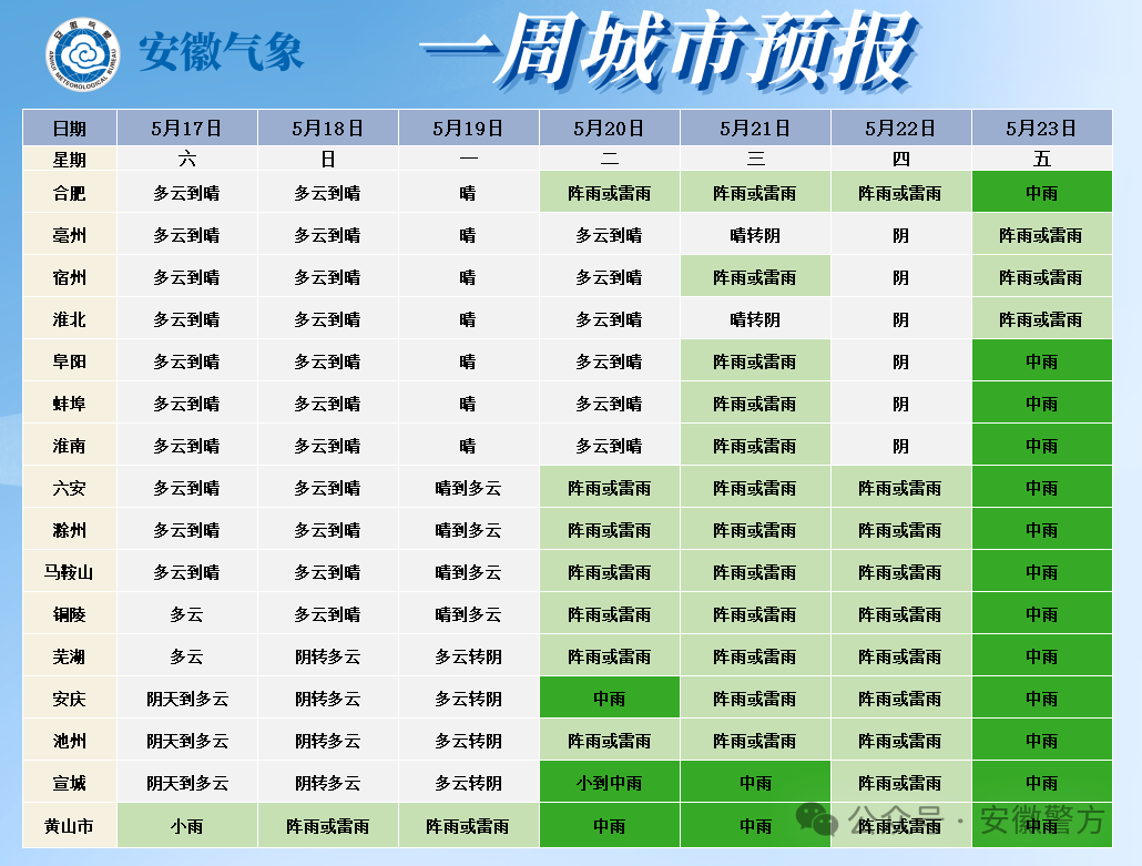 23日(周五):全省阴天有阵雨或雷雨,淮北地区西部和淮河以南部分地区中雨,局部大雨。