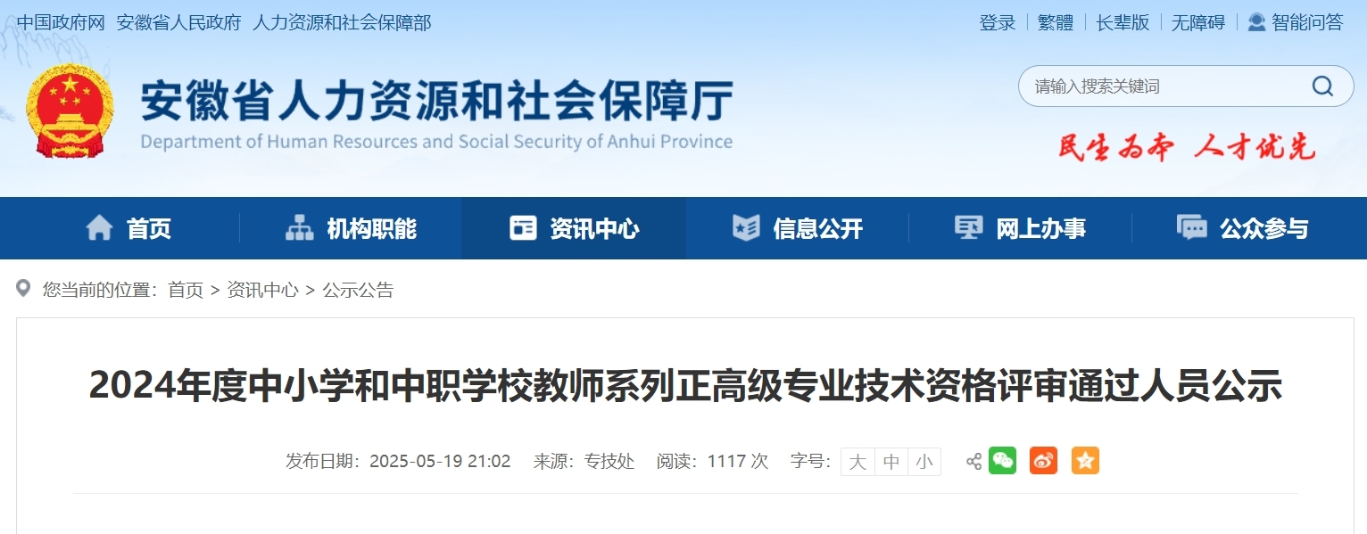 5月19日,安徽省人社厅发布《2024年度中小学和中职学校教师系列正高级专业技术资格评审通过人员公示》。详情如下: