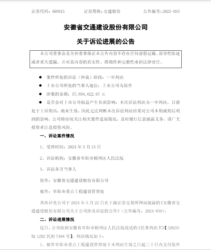 5月20日,交建股份(603815)发布公告,披露一起诉讼进展情况,原告为安徽省交通建设股份有限公司,被告阜阳市重点工程建设管理处,涉案金额57,694,622.67元。