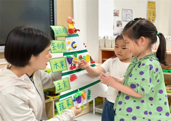中班教师将《中国居民膳食宝塔图》转化为立体拼图,孩子们通过“食物分类大作战游戏”,把谷物、蔬菜、肉类等图片卡贴在对应层级的宝塔中。在挑战中,孩子们惊喜发现:“原来每天要吃最多的是米饭馒头呀!”“我最爱的蛋糕应该放在宝塔尖尖上!”