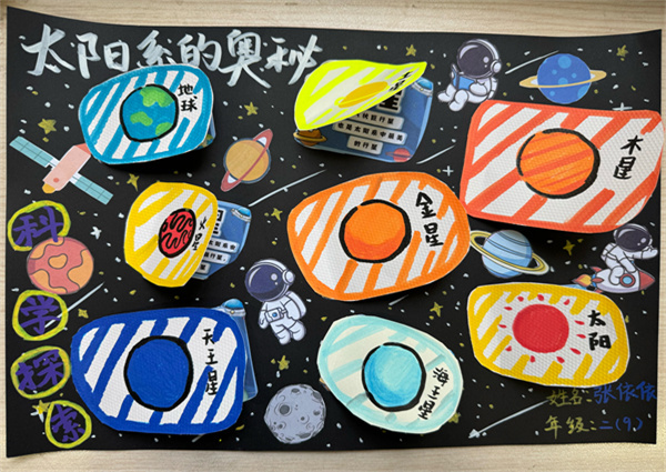 走进充满奥秘的科学殿堂,队员们的目光被各种科技成果牢牢吸引,他们不仅认真观察,仔细聆听,还在笔记本上记满了重点内容。参观归来,他们用彩笔在小报上搭建起属于自己的科学王国:中国“人造太阳”EAST的奇妙世界、宇宙中的奥秘、穿越太阳系……当一张张汇聚着孩子们科学梦想的小报完成时,每个小格子里都闪着好奇的星光——原来科学不是课本上的公式,而是亲手调出的彩虹水、是画纸上立体的行星,更是藏在孩子们笔尖的无限想象。