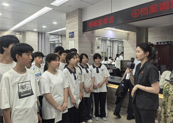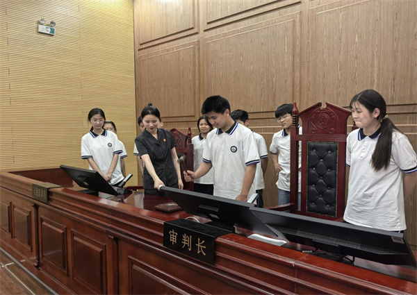 随后,学生们参观审判法庭。审判法庭庄严而肃穆,王友谊向同学们介绍了法庭的布局、设施以及审判流程,让学生们感受到了法律的威严和公正。学生们近距离感受法官、人民陪审员、律师等法律职业者的角色定位和工作职责,对法律职业有了更加直观的了解。
