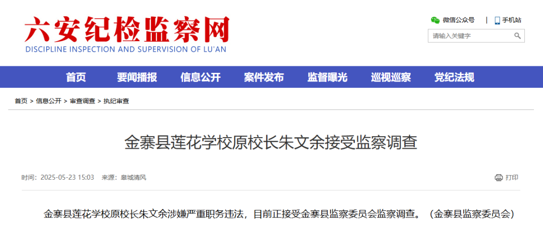 金寨县莲花学校原校长朱文余涉嫌严重职务违法,目前正接受金寨县监察委员会监察调查。(金寨县监察委员会)