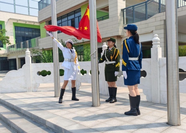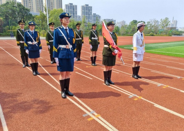 在激昂的中国人民解放军进行曲中,庐阳高中国旗护卫队昂首阔步入场。随着五星红旗冉冉升起,全体师生肃立行注目礼,唱响国歌,以庄重仪式开启新一周的学习生活。