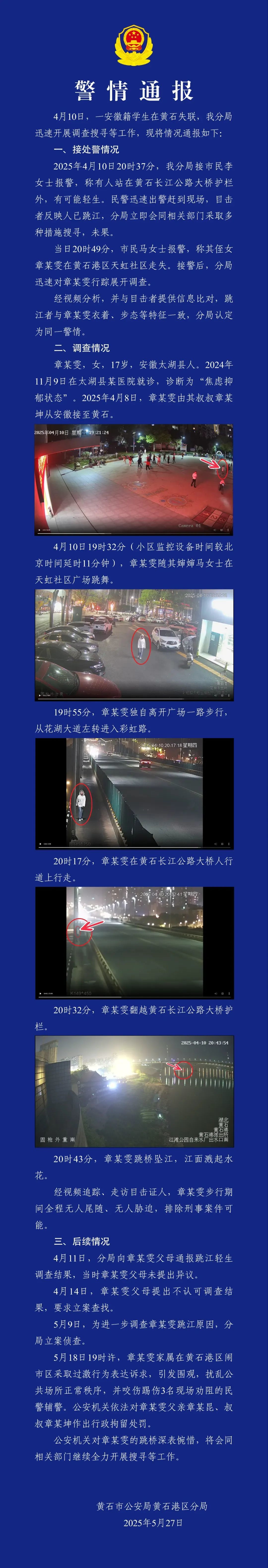 黄石警方通报安徽籍学生失联事件:系跳桥坠江,排除刑事案件可能,其亲属咬伤民警被行拘。