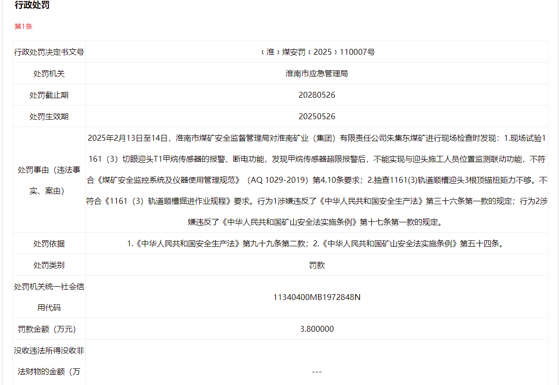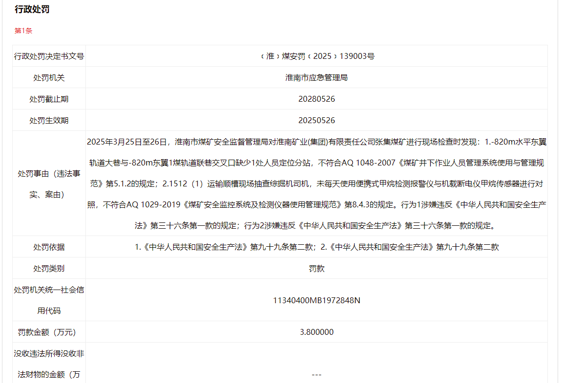 近日,信用淮南披露行政处罚信息,因涉生产安全违法,淮南矿业集团张集煤矿、朱集东煤矿分别被罚3.8万元,行政处罚决定书文号分别为﹝淮﹞煤安罚﹝2025﹞139003号、﹝淮﹞煤安罚﹝2025﹞110007号。