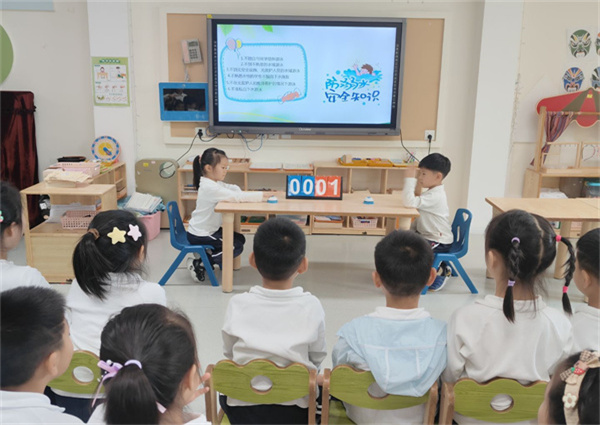 大班幼儿在安全知识大闯关中将防溺水知识转化为生动“实战”,孩子们积极举手参与,学习识别危险水域标志,掌握防溺水“六不准”口诀及基本自救知识。通过趣味抢答、小组共答等环节,将“生命至上、安全第一”的理念植入每位幼儿的心中。