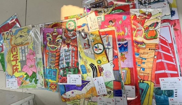 征集结束后,美术教师化身“艺术策展人”,依据色彩与主题精心规划展区动线,设计创意展板造型,打造出沉浸式艺术空间,让育新百廿精神在艺术光影中生动呈现。