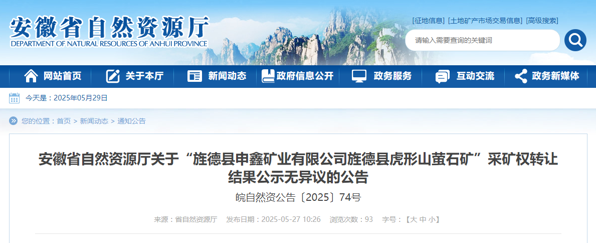 按照《自然资源部关于印发矿业权出让交易规则的通知》(自然资规〔2023〕1号)、《安徽省自然资源厅关于进一步规范矿业权转让有关事项的通知》(皖自然资规〔2021〕3号)等有关规定,依据交易双方申请,省自然资源厅将以上矿业权转让结果在自然资源部和省自然资源厅门户网站进行了公示公开(公示期:2025年5月7日至2025年5月20日),公示期间省自然资源厅未收到相关异议材料。