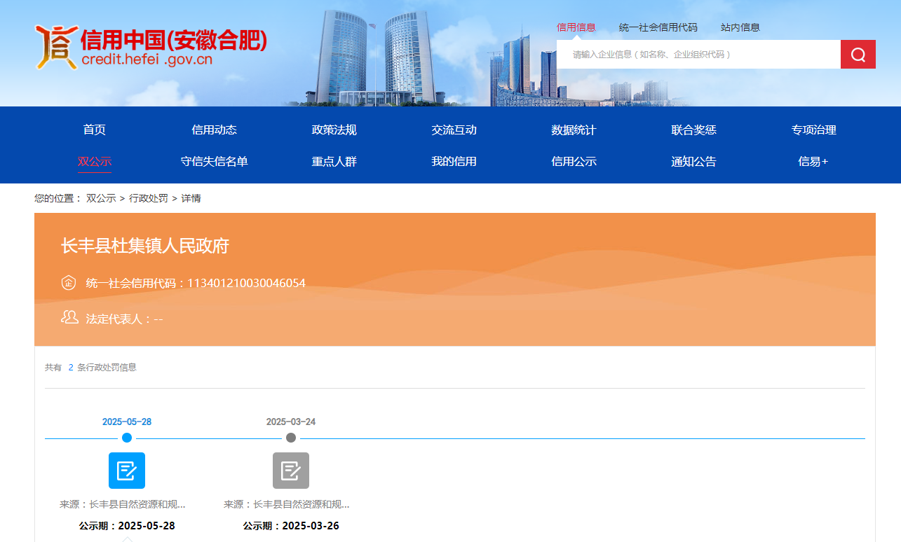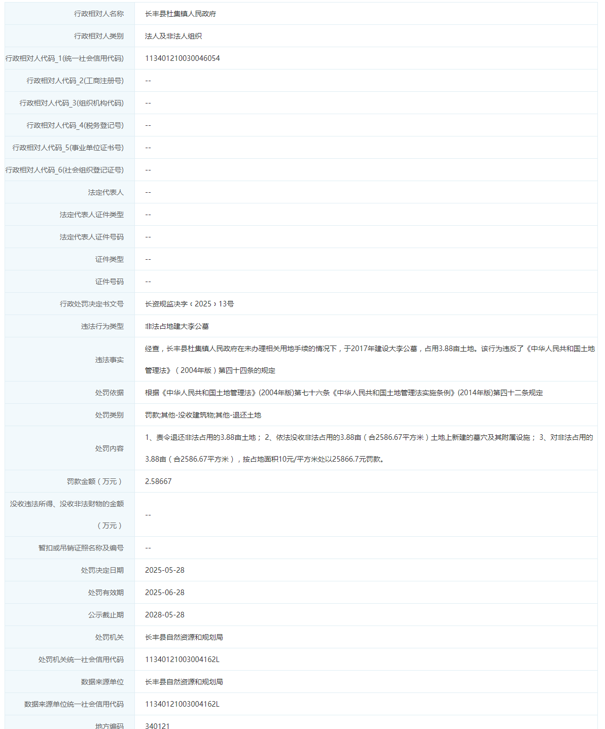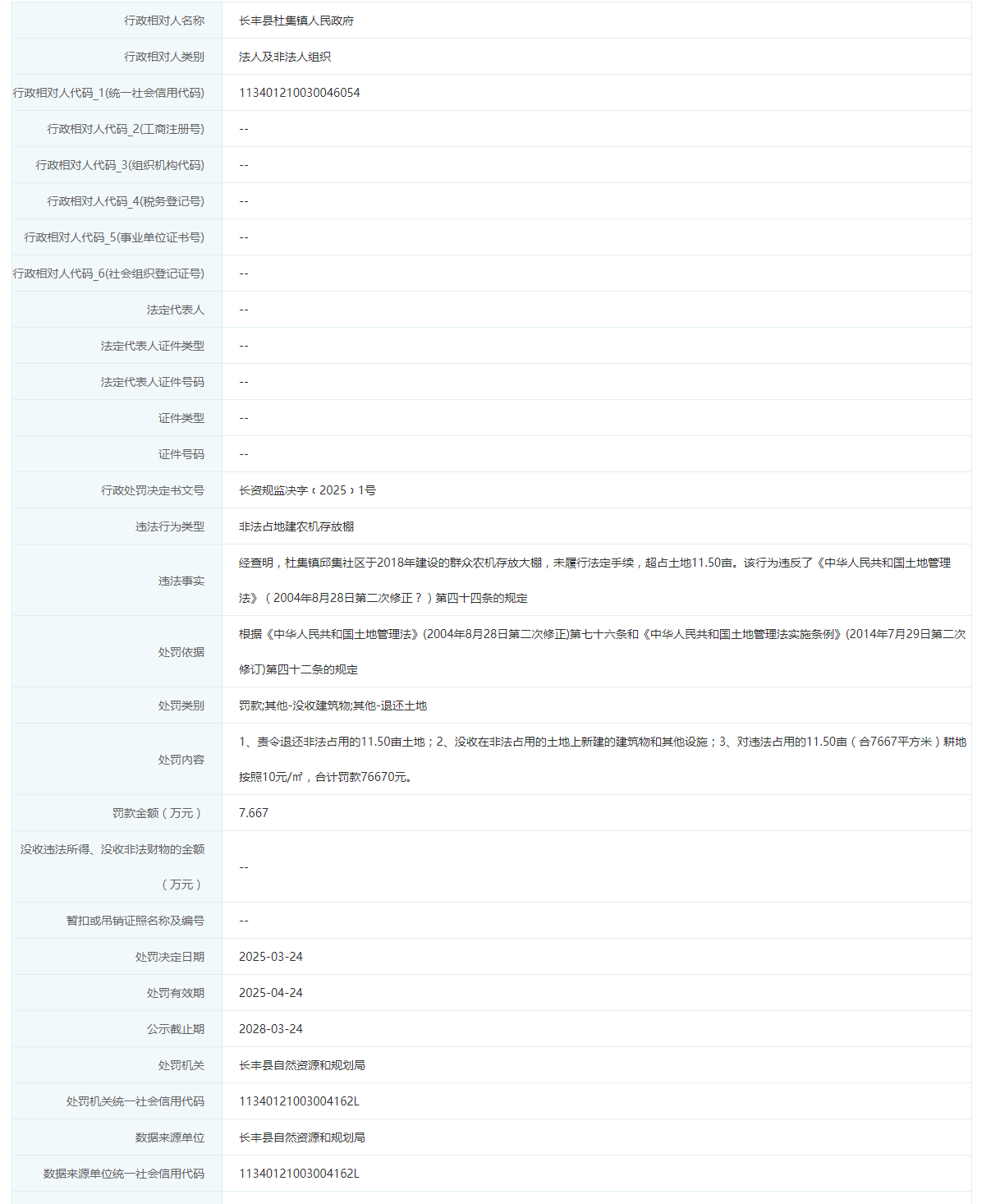 据信用合肥披露行政处罚信息,因非法占地建设公墓、农机存放大棚,安徽长丰杜集镇人民政府合计被罚款10.25万元,行政处罚决定书文号分别为长资规监决字﹝2025﹞13号、﹝2025﹞1号。