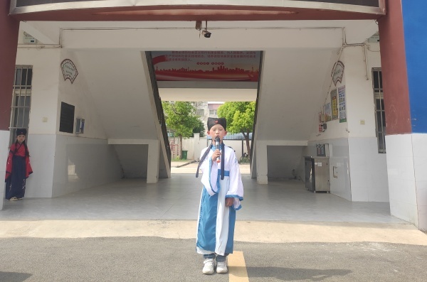 小小舞台,气象万千。二(1)班李成朗同学一登台便引人注目。他身着传统儒生服,神情专注而庄重,一句句《弟子规》吐字如珠落玉盘,抑扬顿挫间尽显古风雅韵。他挺立如松的仪态、清澈明亮的眼神,将经典中“谨而信,泛爱众”的君子之风演绎得淋漓尽致,赢得满堂喝彩。随后登场的三(1)班则将气氛推向第一个高潮。孩子们手持竹简,在《三字经》的韵律中翩然起舞。队形随诵读节奏如春笋舒展、似繁花绽放,时而聚拢如星火,时而散开如星河。童声朗朗,舞姿翩翩,传统智慧与现代活力完美交融。