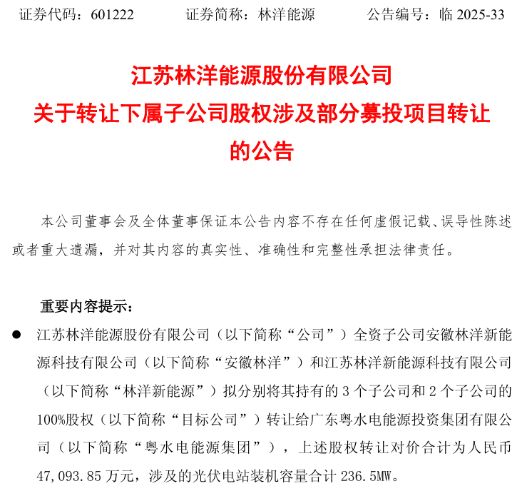 6月3日, 江苏林洋能源股份有限公司(以下简称“林洋能源”,601222.SH)发布公告称,公司全资子公司安徽林洋新能源科技有限公司拟将其持有的濉溪县永瑞现代农业科技有限公司、濉溪永晖新能源科技有限公司、阜阳永明农业太阳能发电有限公司3个子公司100%股权转让给粤水电能源集团;全资子公司林洋新能源拟将其持有的江苏飞展能源科技有限公司和连云港林洋新能源有限公司2个子公司100%股权转让给粤水电能源集团,上述股权转让对价合计为人民币约4.71亿元,涉及的光伏电站装机容量合计236.5MW,包括部分公司第二次非公开发行股票和公开发行可转债募投项目。