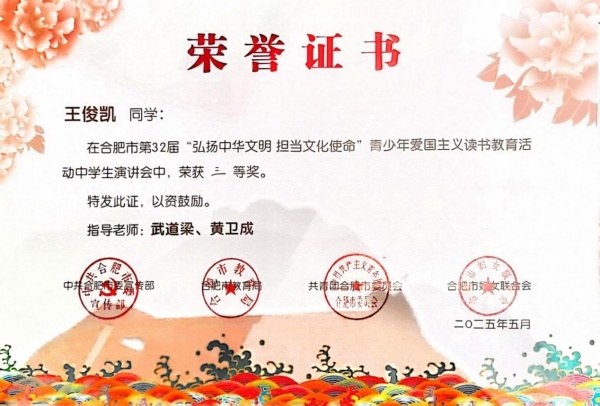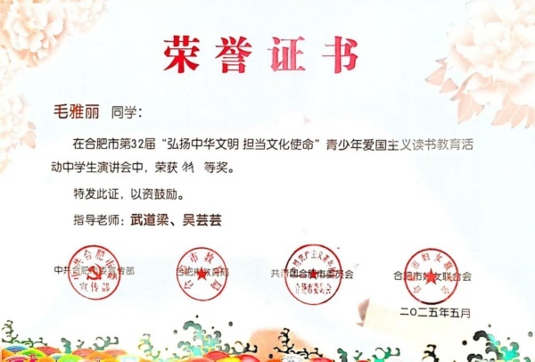 本次爱国主义读书教育活动旨在弘扬爱国主义精神,培育和践行社会主义核心价值观。此次获奖不仅是对两位同学和指导老师个人能力的肯定,更是该校长期以来重视爱国主义教育和学生综合素质培养的成果体现。一直以来,肥东三中都将爱国主义教育贯穿于教育教学的全过程,通过开展多种形式的教育活动,引导学生树立正确的世界观、人生观和价值观,培养学生的爱国情感和社会责任感。今后,学校将继续深入开展爱国主义教育活动,让爱国的种子在校园落地生根,激励更多学生传承中华文明,担当时代使命。(文图/郑丽君 许俊伦)