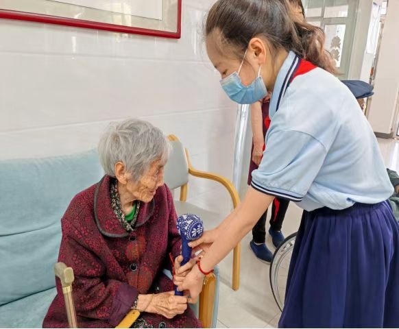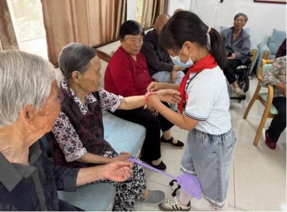 五彩绳系祝福:学生们将寓意祈福纳吉的五彩绳系在老人手腕上,轻声送上“健康长寿”等祝福,真挚话语让老人们倍感温暖。