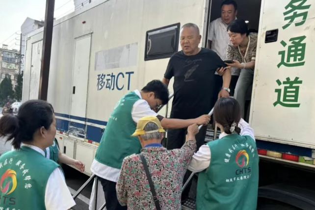 为方便群众检查,市立医院还将移动CT车开到活动现场,实现送诊上门。早早排队等候的居民,也在“绿马甲”志愿者的引领和扶持下,有序登记领号,随后依次上车接受肺部CT检查。“吸气……憋气……呼气……”市民王大爷躺在仪器上跟随指令做动作,不到5分钟便完成了CT检查。他感慨道:“专家带着大型仪器亲自上门给我们做检查,真是太方便了!”