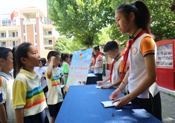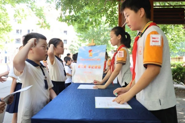 6月6日,合肥市琥珀名城小学开展“牢记党的教导,争做强国少年”入队章争章闯关活动。此次活动聚焦少先队“六知六会”核心内容,点燃了全体预备队员的光荣感与使命感。活动前期,校大队部统一定制《少先队分批入队评价手册》,并通过线上自主探索与线下队课深耕的方式,引导学生在“六知”中厚植理想,在“六会”中锤炼行动自觉。