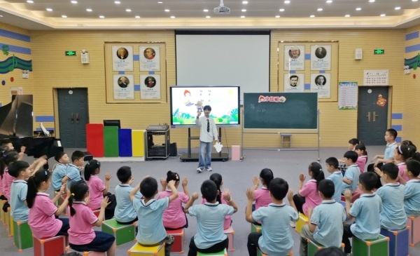 万恩玲老师带来了一堂充满童趣与创意的歌曲《小红帽》。她以一段欢快活泼的音乐律动带领学生进入学习情境,声情并茂地讲述小红帽的童话故事引入课题,在关键情节处设置悬念,引导学生们思考与讨论。教学中,万老师设计了充满童趣的律动进行教学,将歌曲与肢体动作相结合,通过分组比赛、角色扮演等形式,让学生们在欢快的氛围中感受音乐的魅力,培养团队协作能力和艺术表现力。