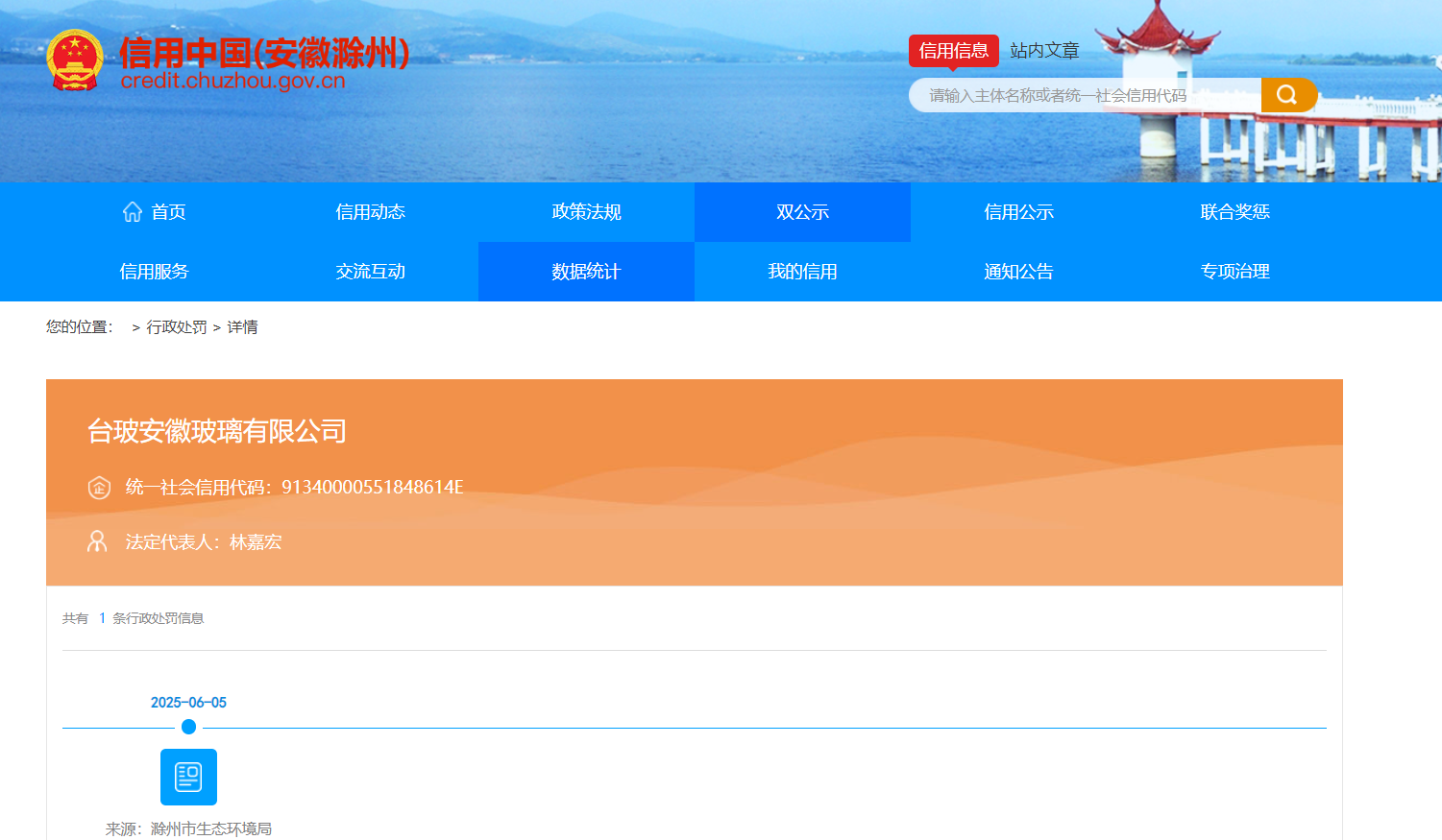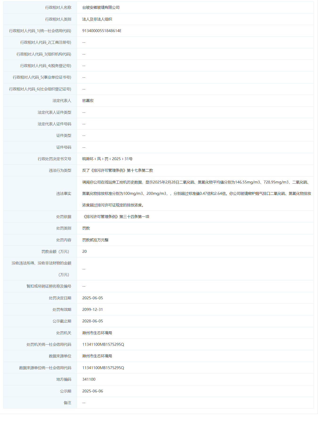 近日,信用滁州披露行政处罚信息,因为违反排污许可管理条例,台玻安徽玻璃有限公司被罚款20万元,行政处罚决定书文号为皖滁环﹝凤﹞罚﹝2025﹞31号。