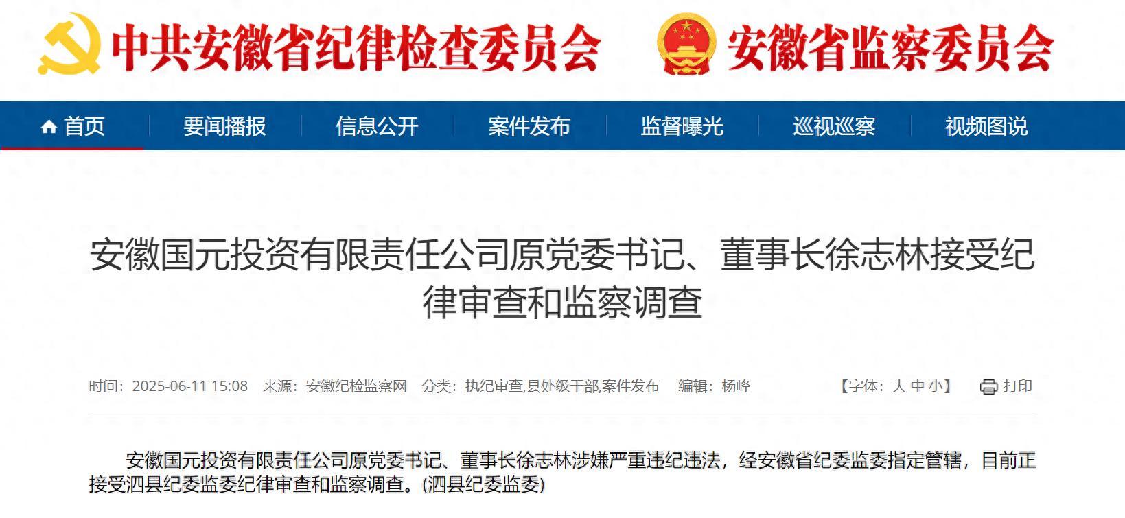 安徽省纪委监委通报显示:安徽国元投资有限责任公司原党委书记、董事长徐志林涉嫌严重违纪违法,经安徽省纪委监委指定管辖,正接受泗县纪委监委纪律审查和监察调查。