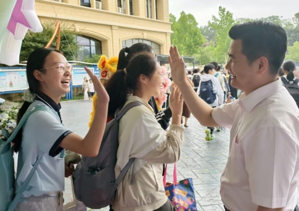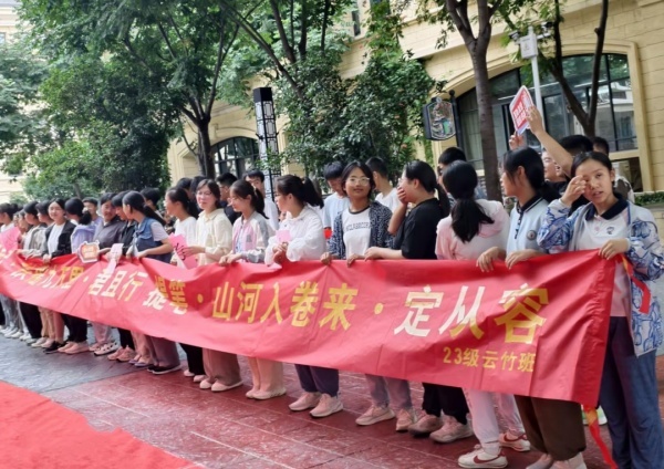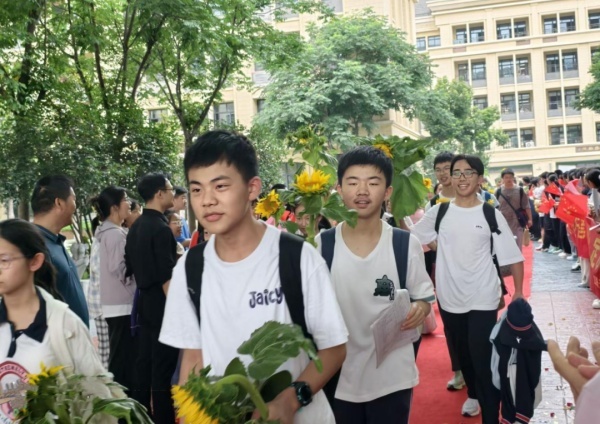 当九年级学生携带行李走出教学楼时,九年级全体老师和八年级师生代表早已整齐列队在校门口两侧。学弟学妹们手持自制的祝福卡片和鲜花,热情高呼“学长学姐加油”“前程似锦”。温暖的笑容、真挚的呐喊声回荡在校园,传递着对毕业生的美好祝愿。