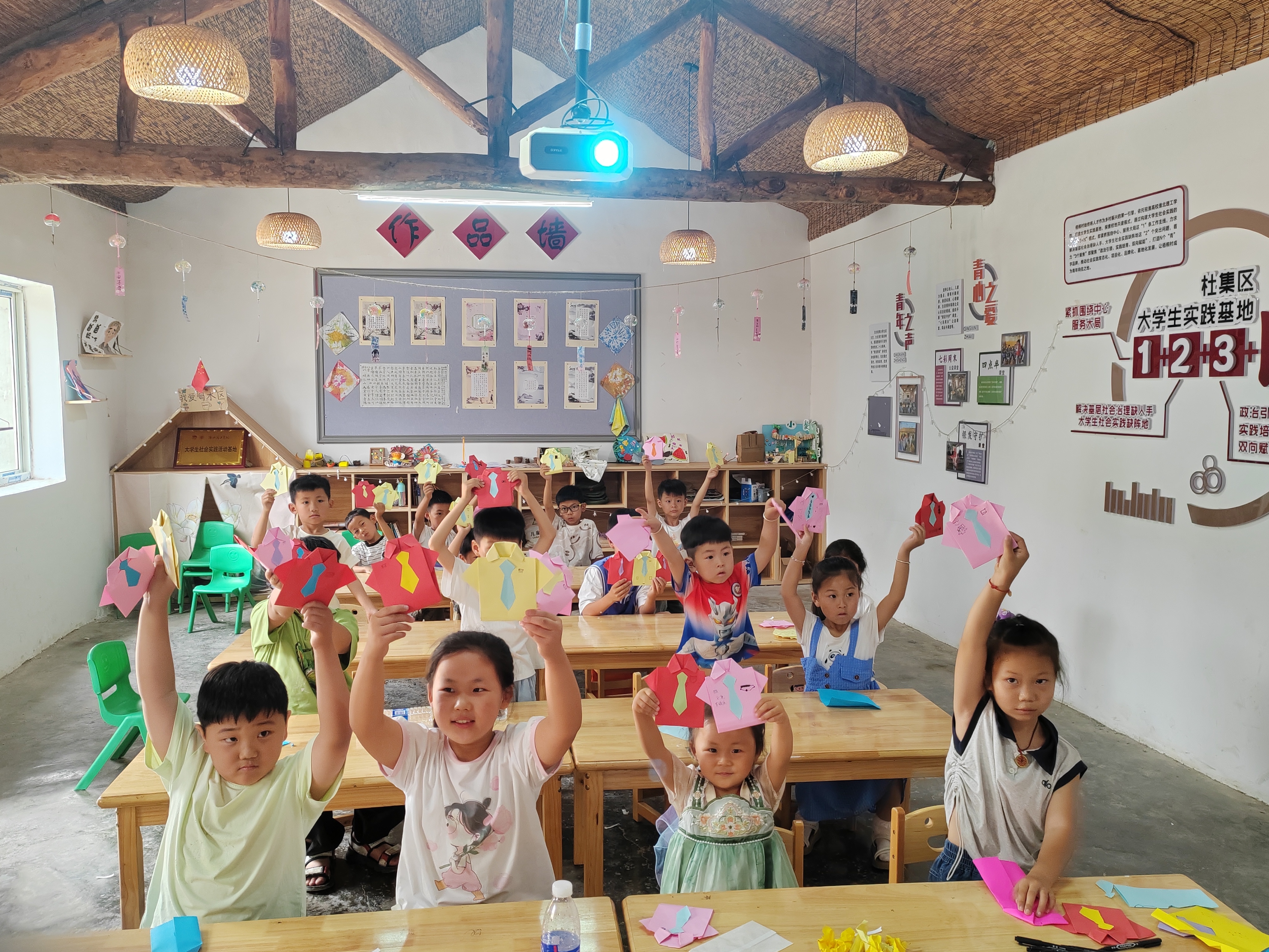 紧接着,手工实践课程精彩启幕。志愿者手持彩纸,细致讲解折纸技巧,从简单的对折、裁剪,到创意造型设计,一步步耐心示范。孩子们专注投入,小手灵动翻飞,将彩纸折出奇妙形状。有的折出精致的“衬衫领带”,为父亲送上温馨祝福;有的发挥想象,折出独特的创意作品,色彩与巧思碰撞,诞生一件件饱含童真的手工作品。遇到难题时,志愿者俯身指导,伙伴间相互启发,教室里洋溢着专注与互助的温暖气息。