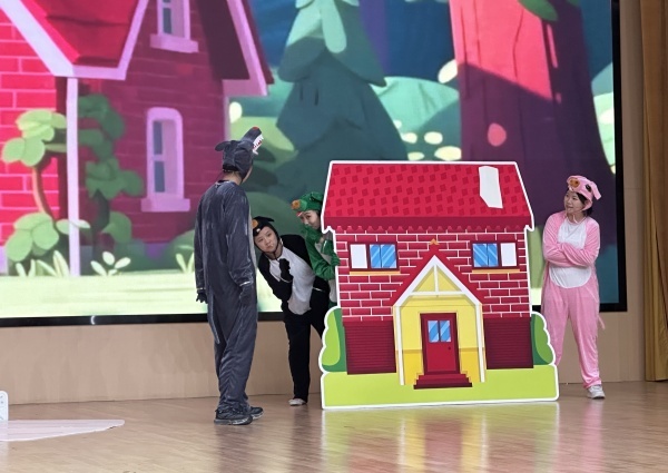 从剧本改编到音乐编配,从角色塑造到舞台调度,育新小学音乐教师团队全身心投入。她们深入挖掘教材内涵,巧妙融合戏剧元素与音乐教学,将耳熟能详的故事赋予全新的艺术生命力。创作过程中,老师们反复研讨,精心设计符合二年级学生认知的生动情节与音乐表现,力求在寓教于乐中传递团结协作、勤劳智慧的深刻主题。排练阶段,教师们化身“三只小猪”和“大灰狼”,一丝不苟地打磨台词、动作、表情与音乐的契合度,克服时间紧、任务重的困难,利用课余时间精研细磨,只为在舞台上完美呈现童真童趣的经典故事与教材音乐的精彩融合。