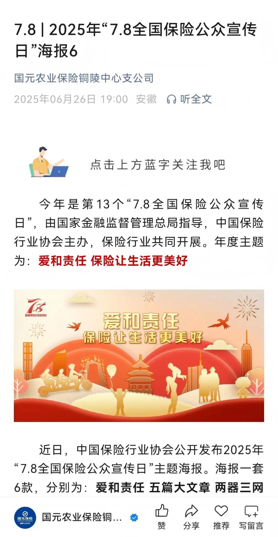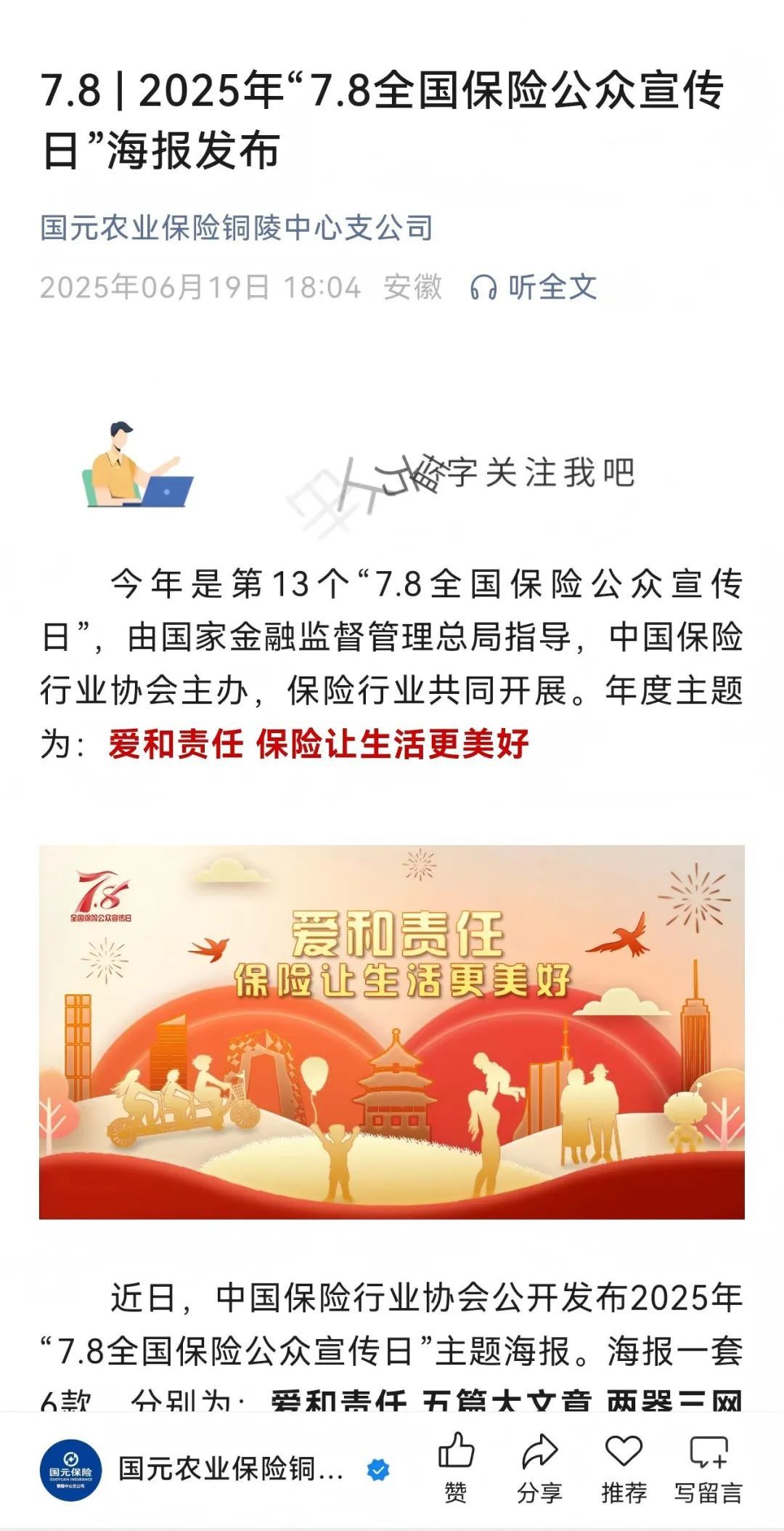公司自6月19日起在微信公众号平台持续进行2025年“7.8全国保险公众宣传日”主题宣传。