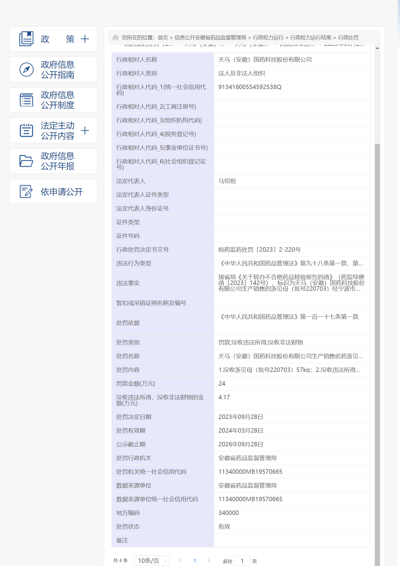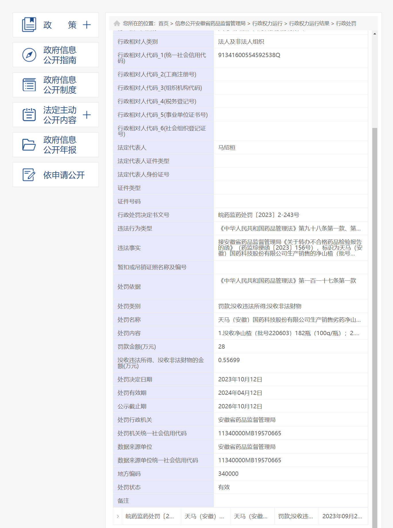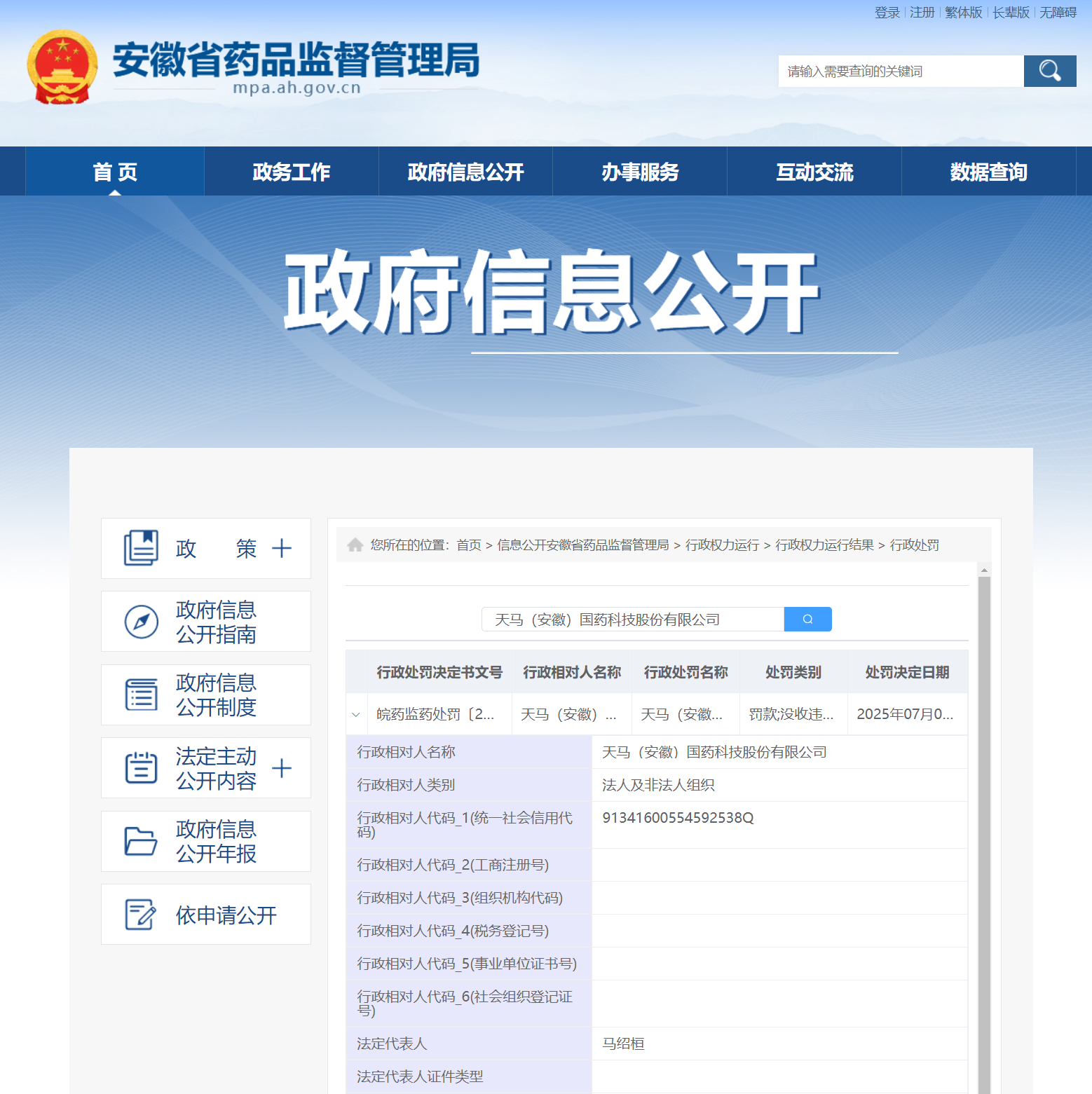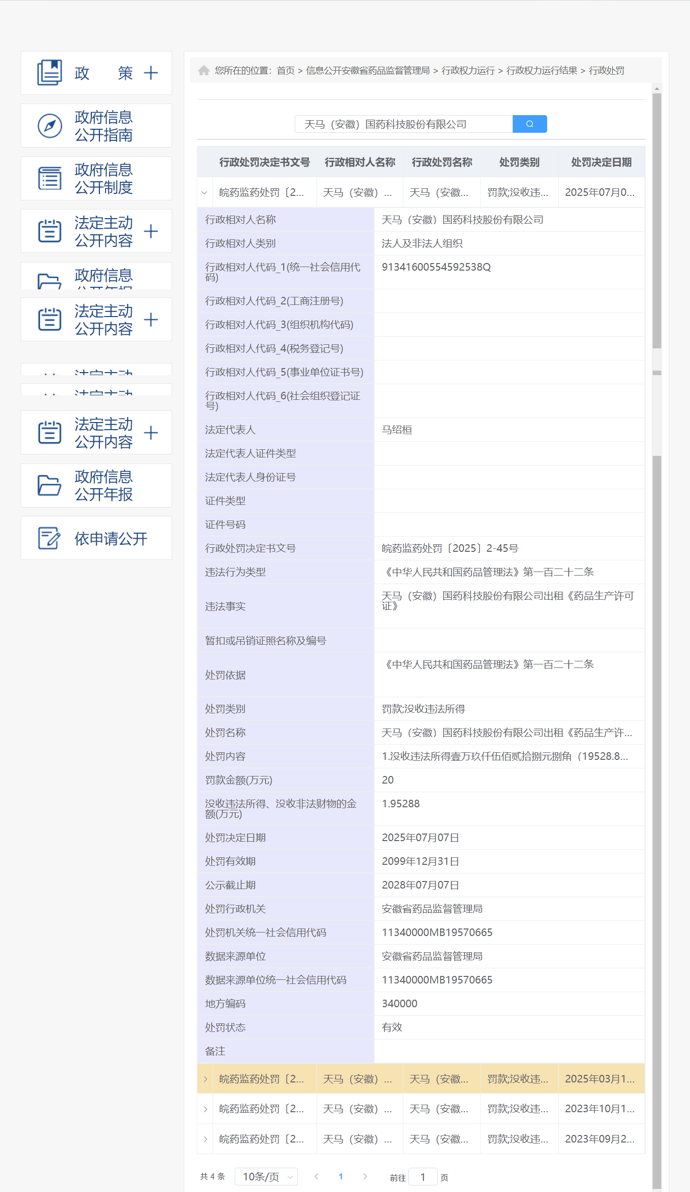近日,安徽省药监局披露行政处罚信息,因出借药品生产许可证》,天马(安徽)国药科技股份有限公司被处罚款20万元,行政处罚决定书文号为皖药监药处罚〔2025〕2-45号。