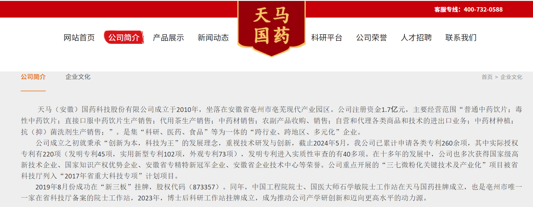 2019年8月份成功在“新三板”挂牌,股权代码(873357)。同年,中国工程院院士、国医大师石学敏院士工作站在天马国药挂牌成立,也是亳州市唯一一家在省科技厅备案的院士工作站,2023年,博士后科研工作站挂牌成立,成为推动公司产学研创新和迈向更高水平的动力源。