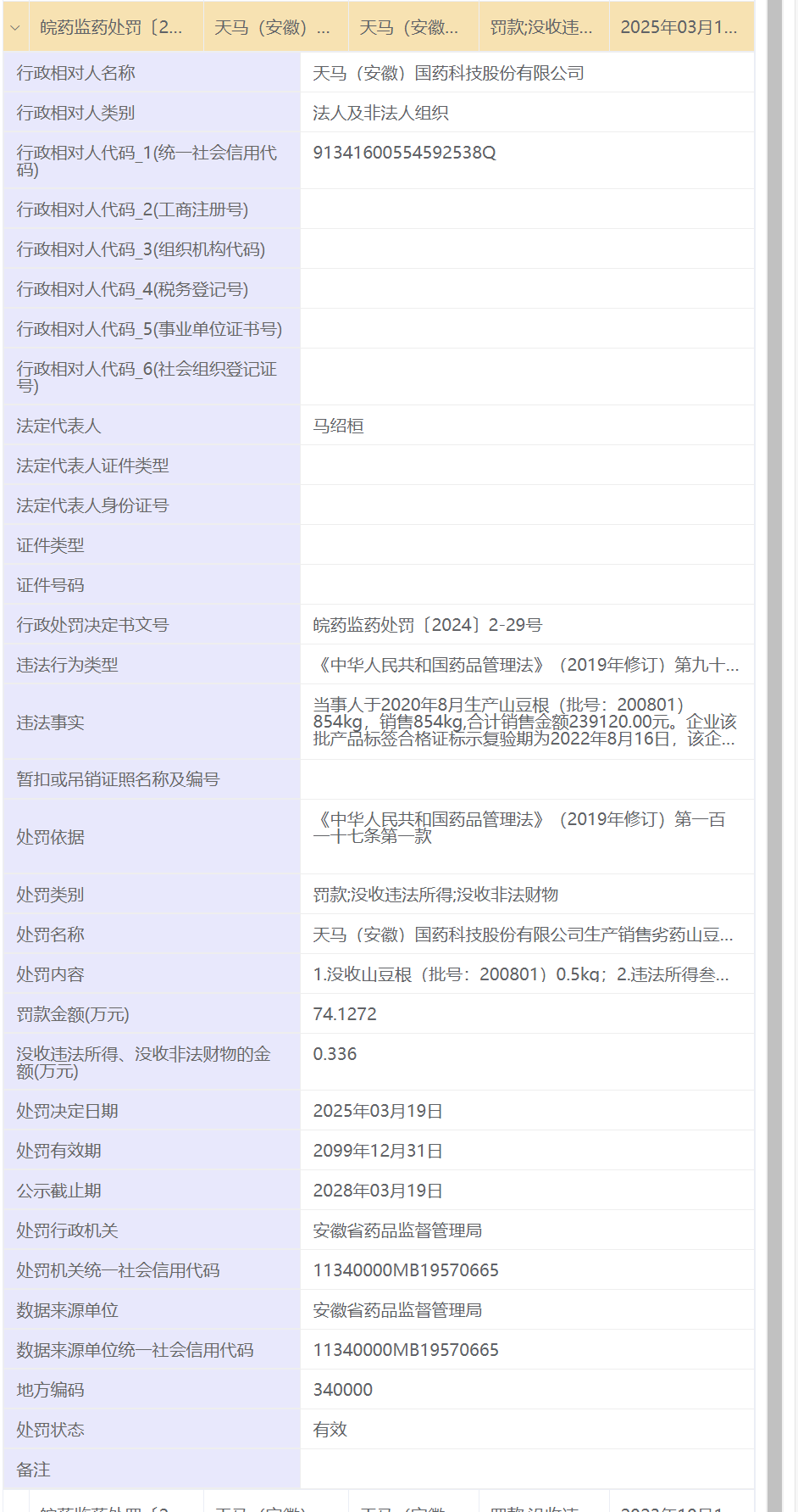 今年3月19日,该公司因生产销售劣药山豆根被处罚款74.1272万元,生产销售劣药达854kg,合计销售金额239120.00元。行政处罚决定书文号为皖药监药处罚〔2024〕2-29号。