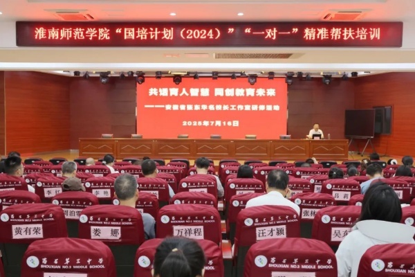 为探索新时代办学治校新路径,7月16日下午,淮南师范学院“国培计划(2024)”“一对一”精准帮扶培训团队走进寿县三中,与张东华名校长工作室联合开展以“共话育人智慧,同创教育未来”为主题的专题研修活动。活动围绕党组织领导的校长负责制、新时代教师观、学生观等核心议题展开深入探讨,来自各地的名校长及骨干教师代表齐聚一堂,共探教育高质量发展之道。