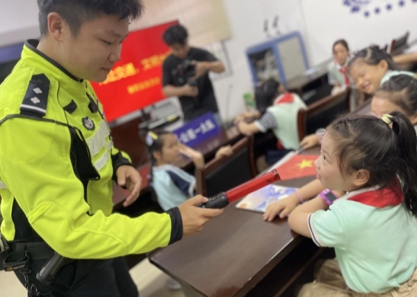 此外,民警还展示了警用器械和铁骑风采,邀请学生们乘坐警用摩托,组织大家体验现场执勤,学生代表也向执勤的交警致敬“送清凉”。