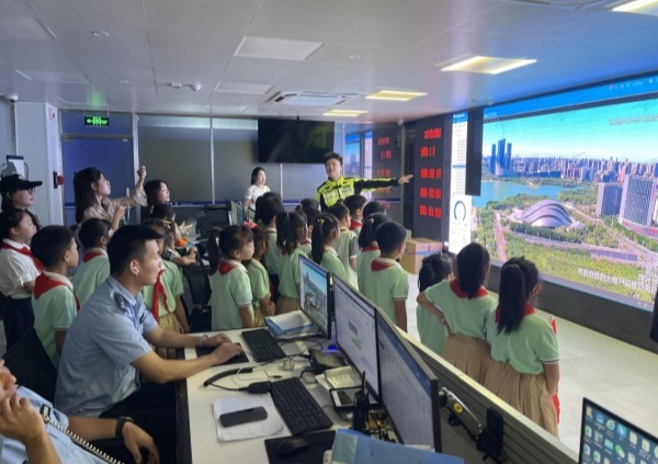 此次活动中,公巡一大队为同学们搭建了一个沉浸式学习交通安全知识的平台。在公巡一大队铁骑中队民警朱志杰带领下,学生们参观了大队的日常工作场所,介绍了交通指挥分控中心的“黑科技”及应用,观看了“高空无人机巡查”演示及铁骑风采。