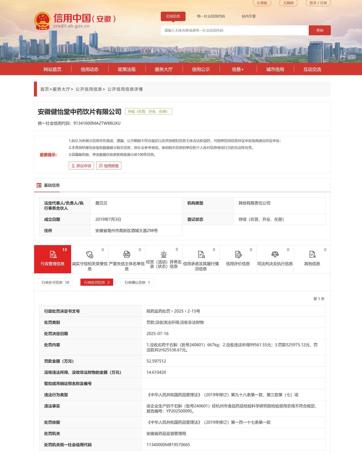 近日,信用安徽披露行政处罚信息,因生产销售劣质干石斛,安徽健怡堂中药饮片有限公司被罚52.597512万元,没收违法所得、没收非法财物金额14.61042万元,行政处罚决定书文为皖药监药处罚(2025)2-15号。