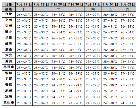 气温预报:27日至8月2日全省大部分地区高温天气有所缓和,仅淮河以北部分地区最高气温超过35℃。8月3日后全省高温天气再次发展,大部分地区最高气温35~38℃,其中淮北部分地区最高气温可达39℃以上。