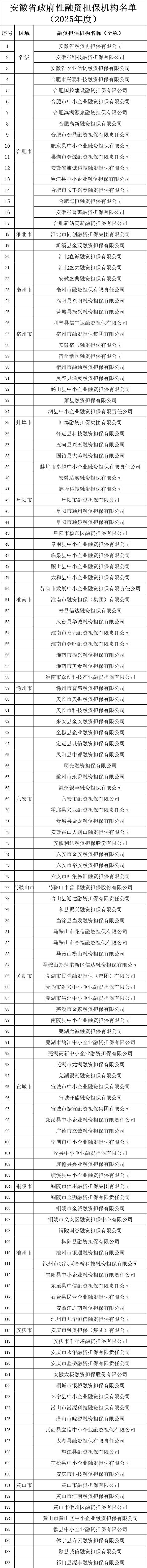 8月1日,安徽省财政厅发布安徽省政府性融资担保机构名单(2025年度)。