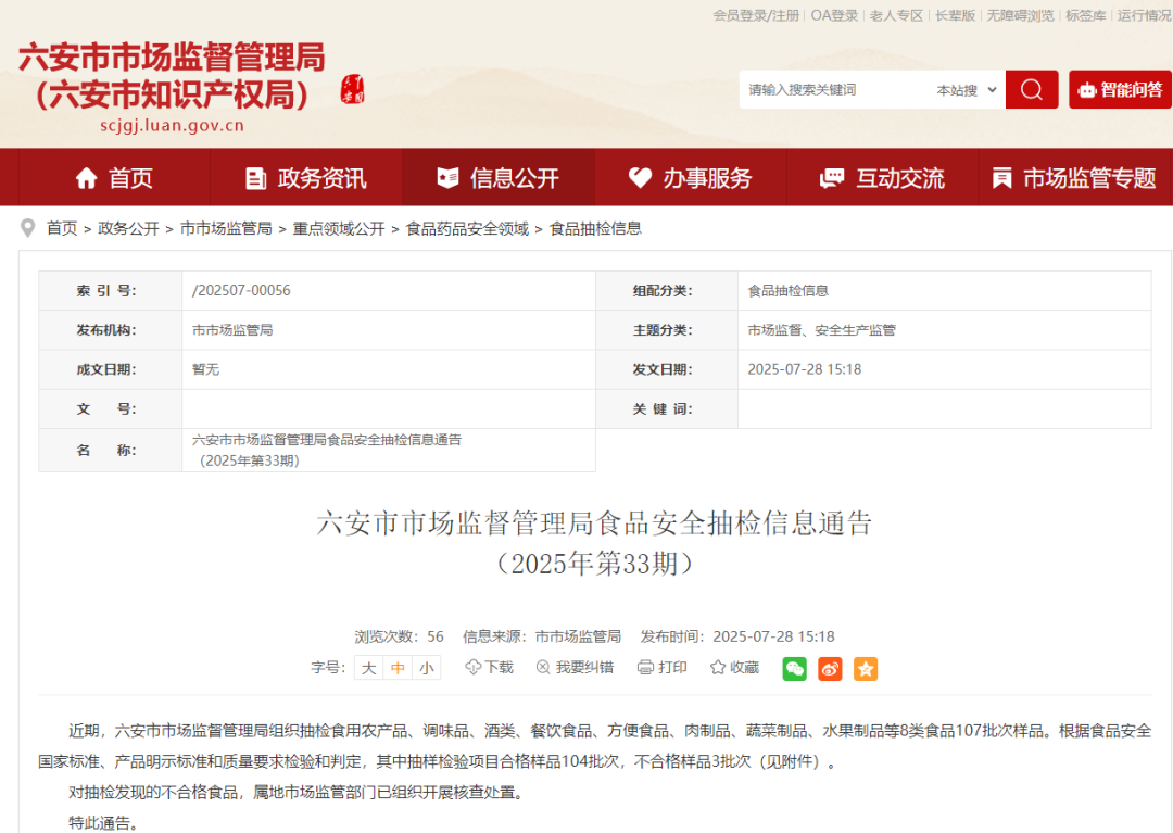近期,六安市市场监督管理局组织抽检食用农产品、调味品、酒类、餐饮食品、方便食品、肉制品、蔬菜制品、水果制品等8类食品107批次样品。根据食品安全国家标准、产品明示标准和质量要求检验和判定,其中抽样检验项目合格样品104批次,不合格样品3批次(见附件)。