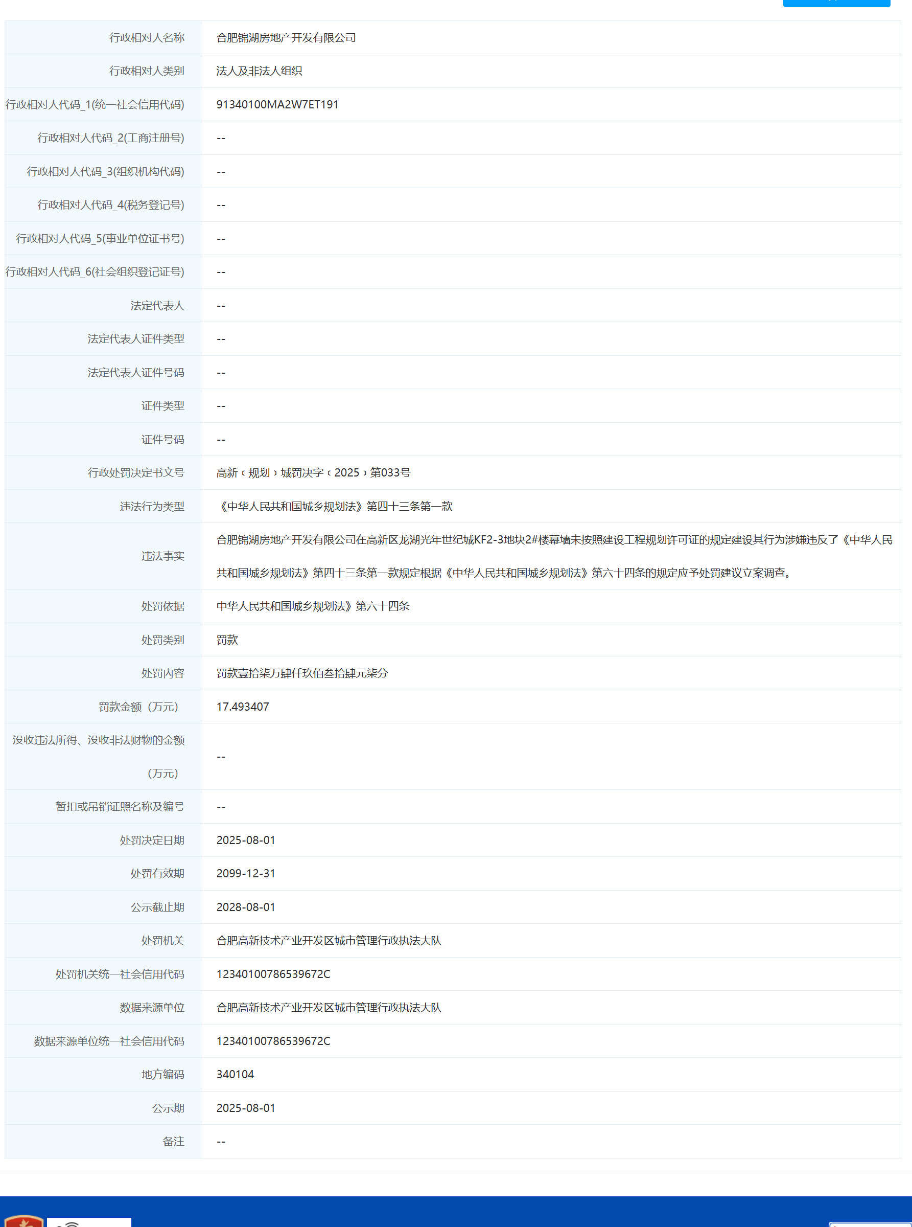 近日,信用合肥披露行政处罚信息,因违规建设,合肥锦湖房地产开发有限公司被罚款17.493407万元,行政处罚决定书文号为高新(规划)城罚决字(2025)第033号。