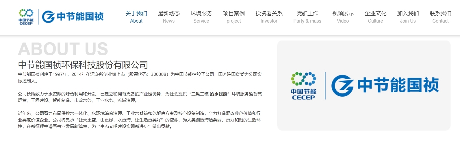 公司官网信息显示,中节能国祯创建于1997年,2014年在深交所创业板上市(股票代码:300388)为中国节能控股子公司,国务院国资委为公司实际控制人。