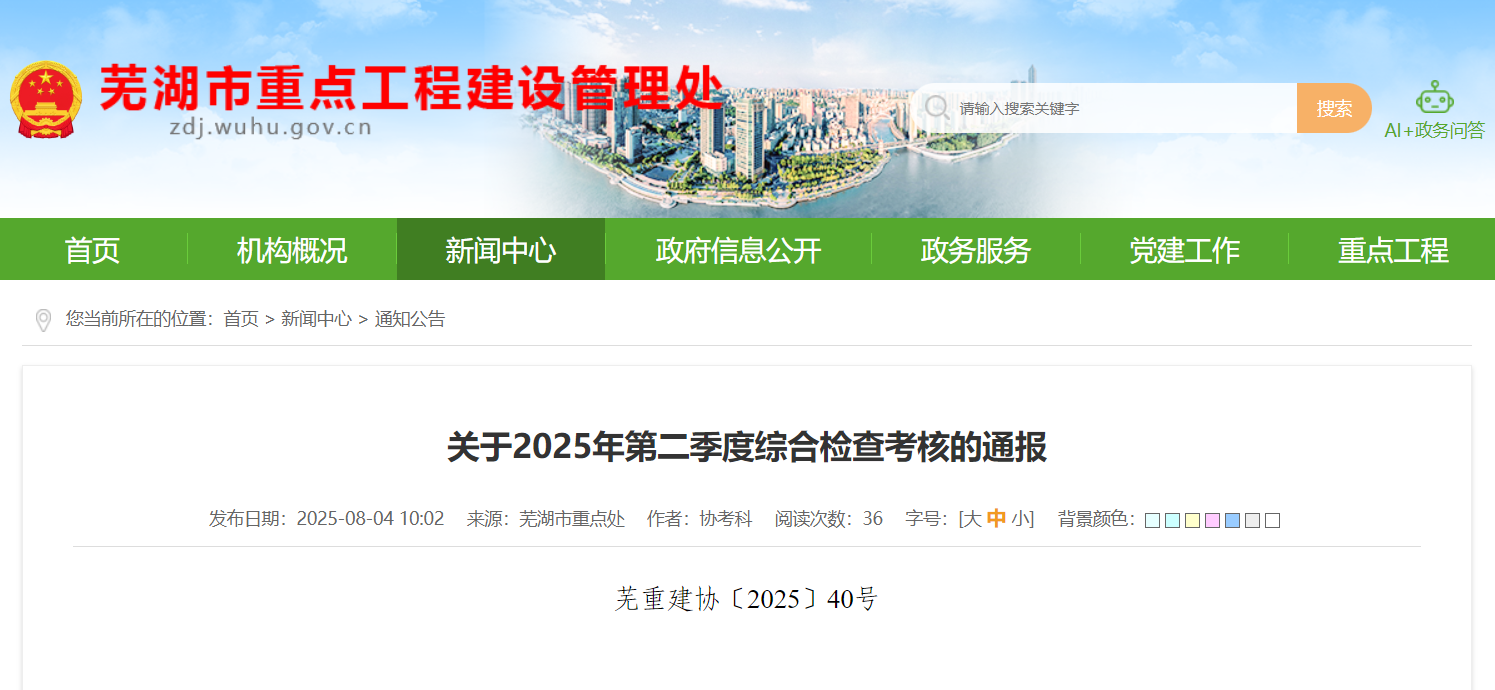 根据《关于印发<处管项目综合检查考核办法(试行)>的通知》(芜重建协[2025]4号)文件,我处组织开展了2025年第二季度综合检查考核,合计对14项在建项目开展综合检查考核,共下发整改通知单14份,除芜湖"大清监狱遗址"建筑修缮工程未在规定期限内完成整改外,其余项目均限期完成了整改。现将本季度综合检查考核情况通报如下: