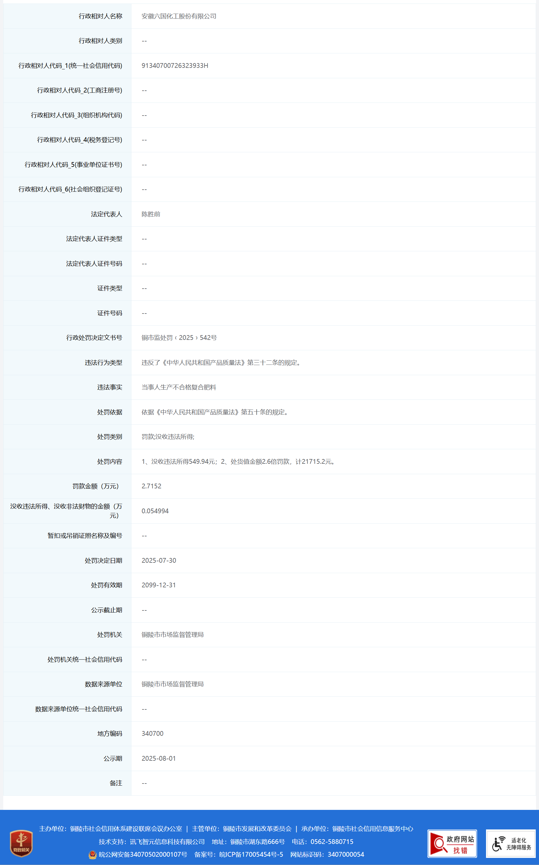 近日,信用铜陵披露行政处罚信息,因生产不合格复合肥料,安徽六国化工股份有限公司被罚4.88672万元,没收违法所得549.94元,行政处罚决定文书号为铜市监处罚(2025)542号。