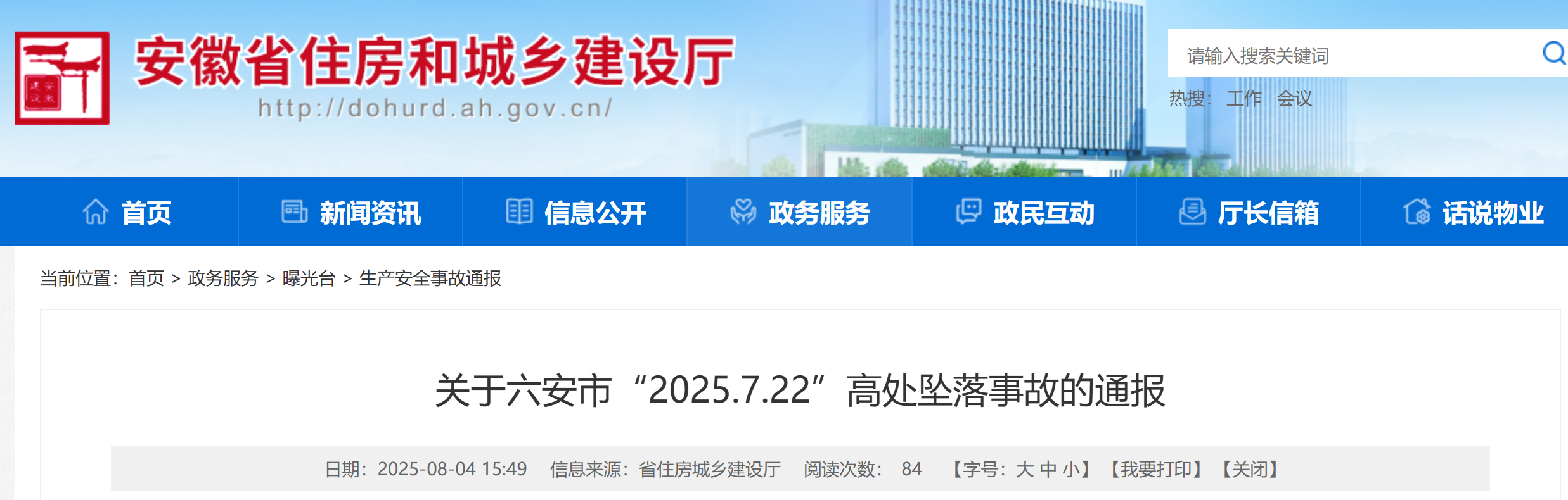 8月4日,据安徽省住建厅通报,2025 年 7 月 22 日 14 时 30 分左右,六安市舒城县年产伺服电机转轴 400 万件技改扩建项目发生一起高处坠落事故,造成 1 人死亡。