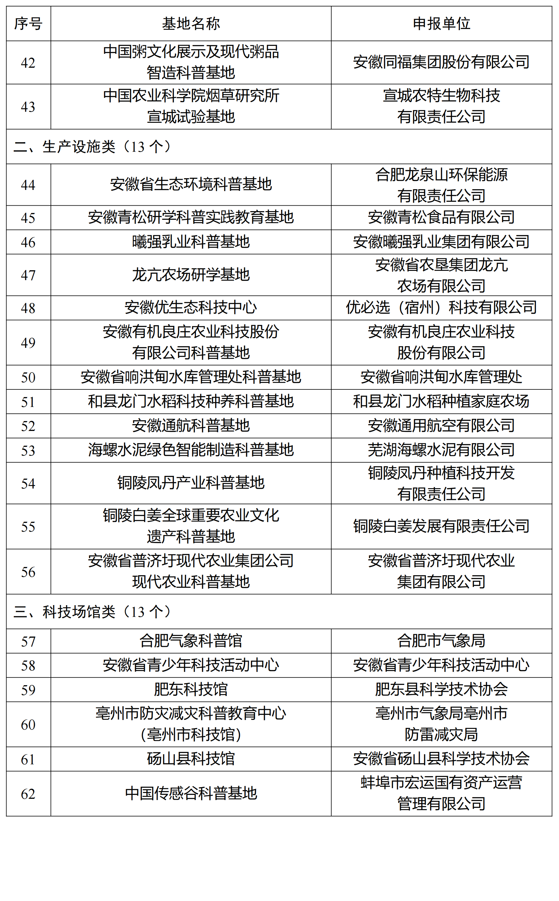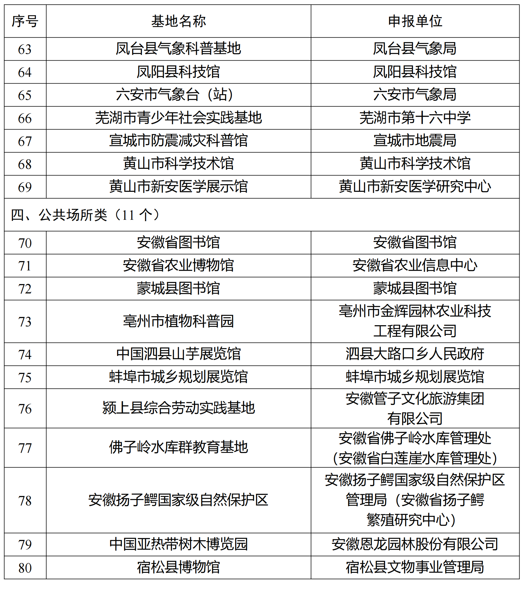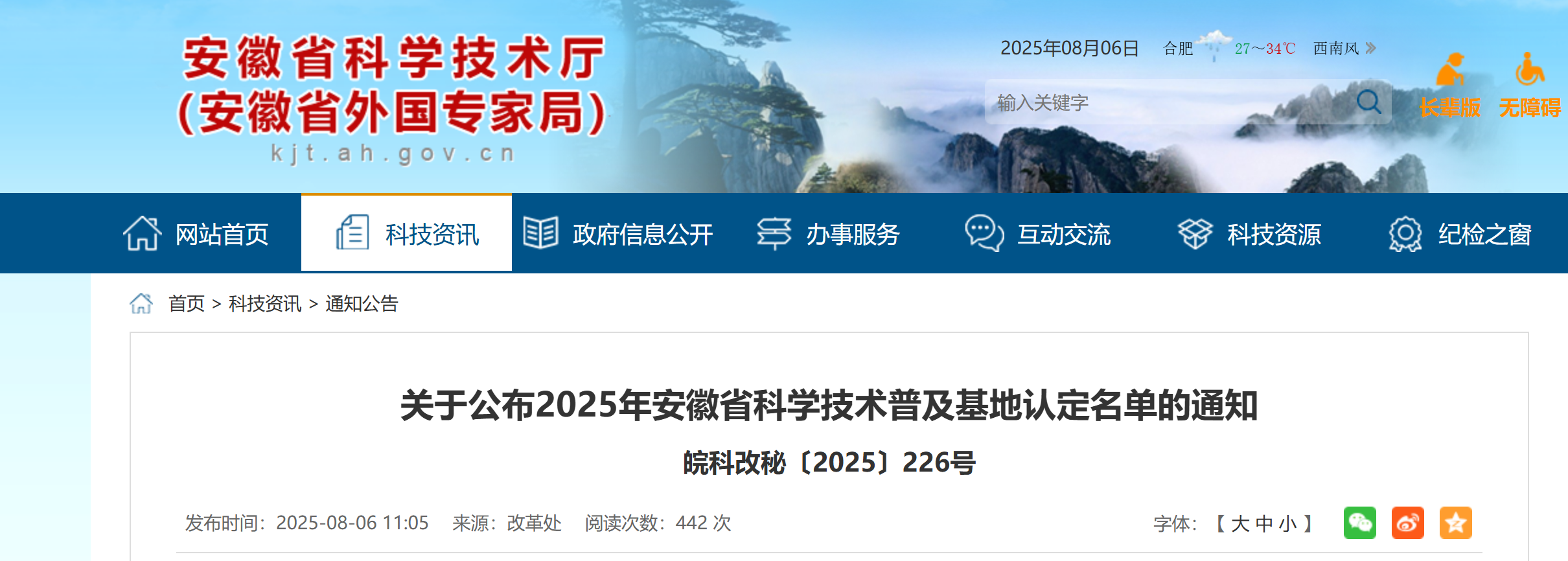 为贯彻落实《中华人民共和国科学技术普及法》《安徽省科学技术普及条例》,不断加强我省科普能力建设,更好地发挥省级科普基地在科学技术普及方面的示范、带动作用,根据《安徽省科学技术普及基地认定办法(试行)》有关精神,省科技厅组织开展了省科学技术普及基地申报认定工作,经专家评审、实地勘察、公示等程序,现认定精准智能化学教育科研科普基地等80家单位为2025年安徽省科学技术普及基地(见附件)。