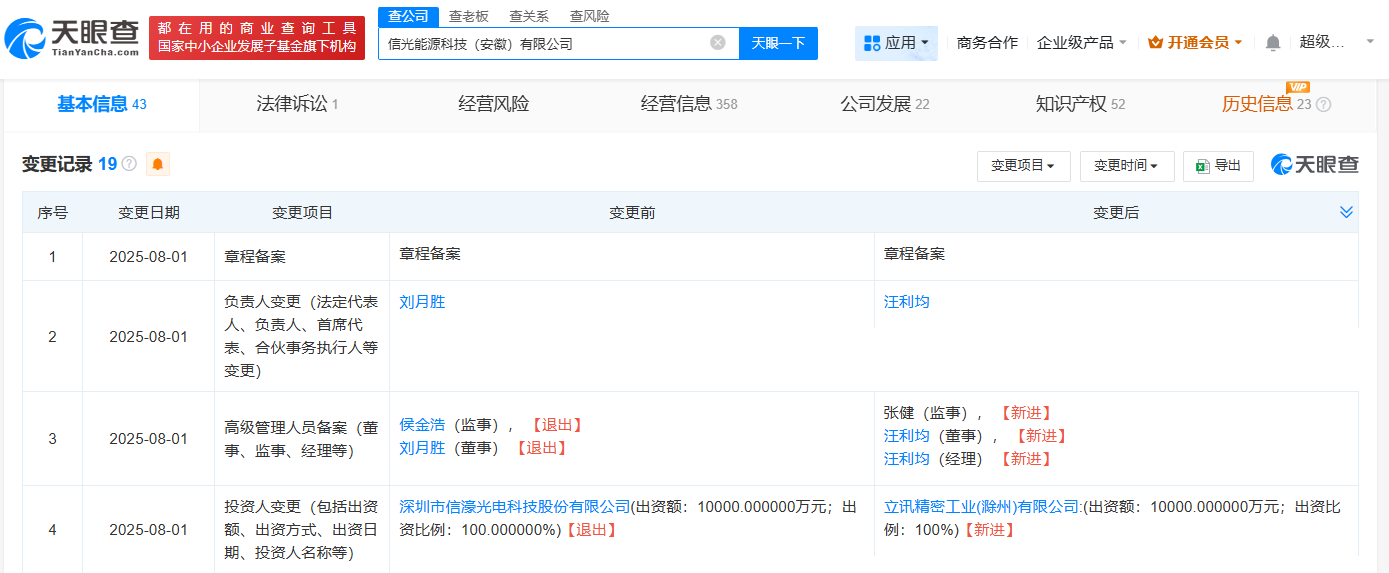 天眼查工商信息显示,近日,信光能源科技(安徽)有限公司发生工商变更,信濠光电(301051)退出股东行列,新增立讯精密(002475)旗下立讯精密工业(滁州)有限公司全资持股,同时该公司法定代表人等发生变更。据报道,此前,信濠光电发布公告,与立讯精密签署了《股权转让意向协议》,拟转让全资子公司信光能源科技(安徽)有限公司100%股权给立讯精密。