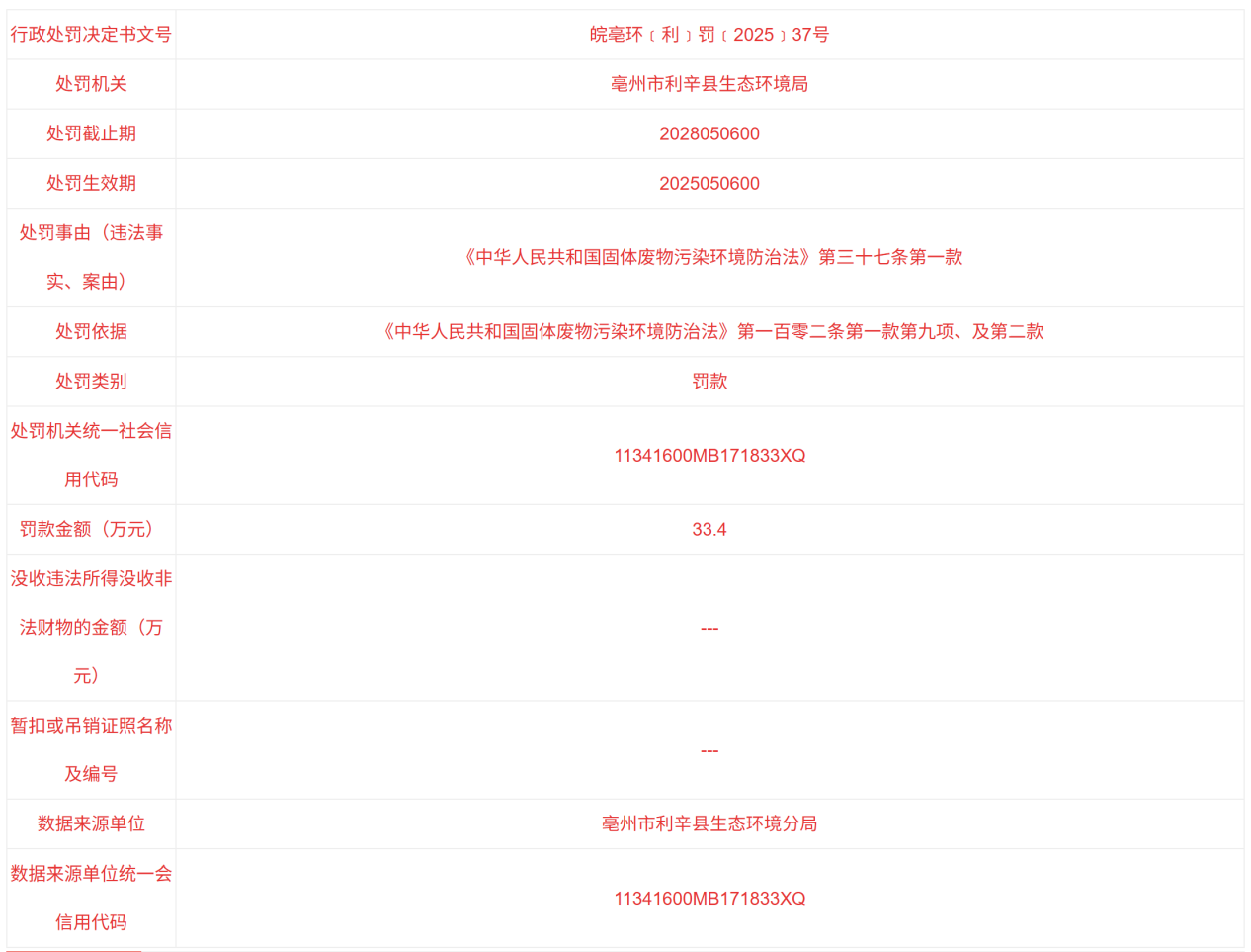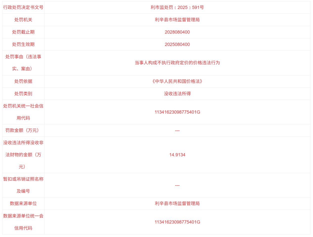 公开处罚信息显示,中煤新集利辛发电有限公司构成不执行政府定价价格的违法行为,根据《中华人民共和国价格法》,利辛县市场监督管理局决定没收中煤新集利辛发电有限公司违法所得金额14.9134万元。