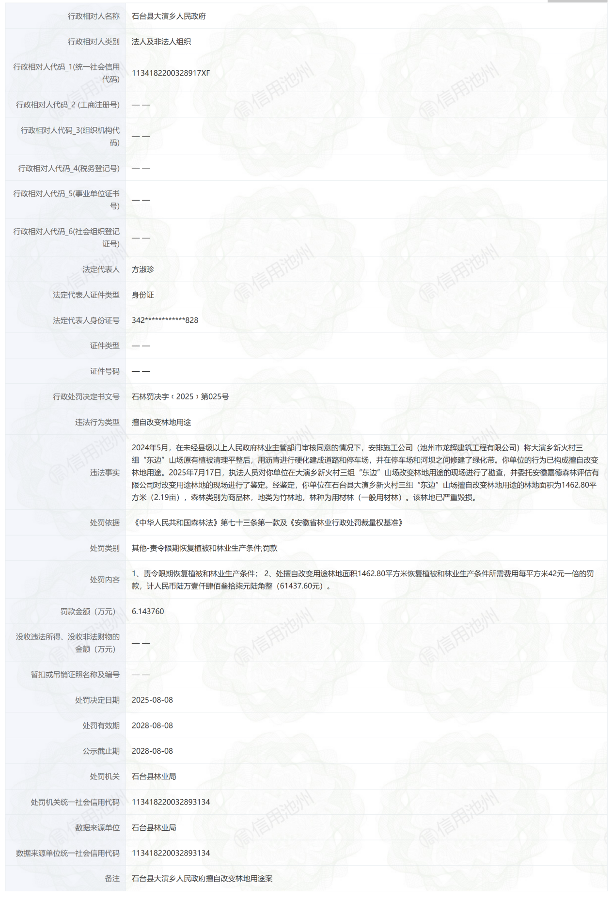 近日,信用池州披露行政处罚信息,因擅自改变林地用途,石台县大演乡人民政府被罚款6.143760万元,行政处罚决定书文号为石林罚决字﹝2025﹞第025号。