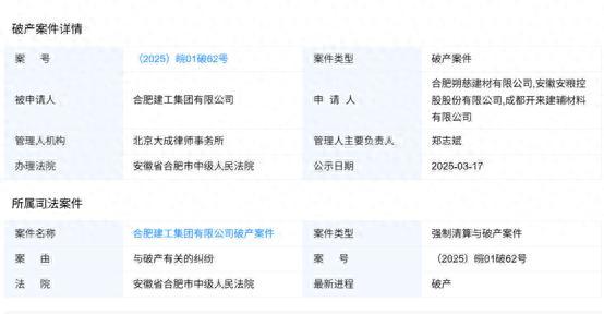 事实上,合肥建工集团已被申请破产。今年3月17日,合肥朔慈建材有限公司、成都开来建辅材料有限公司以合肥建工不能清偿到期债务,且明显缺乏清偿能力为由,向合肥市中院申请合肥建工破产清算。安徽安粮控股股份有限公司(简称“安粮控股”)以合肥建工资不抵债,但具备重整价值为由,申请合肥建工破产重整。
