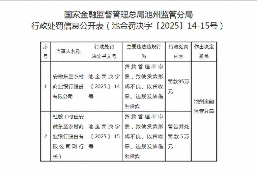 8月13日,国家金融监督管理总局池州监管分局行政处罚信息公开表显示,因贷款管理不审慎,致使贷款形成不良、以贷收息、违规发放借名贷款,安徽东至农村商业银行股份有限公司被罚款95万元,杜敏(时任安徽东至农村商业银行股份有限公司副行长)被警告并处罚款5万元。